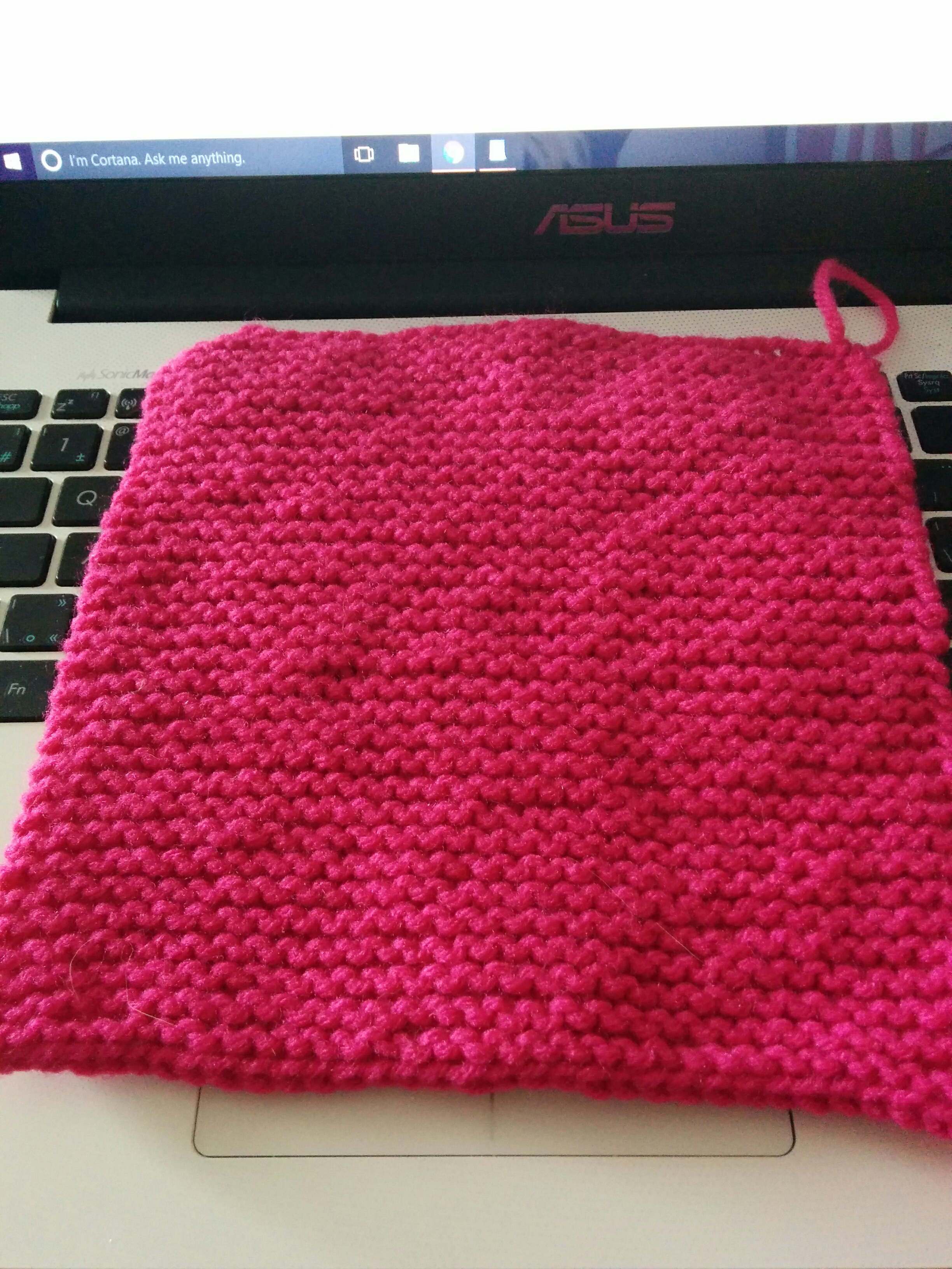 Monter 33 mailles avec les aiguilles #4mm et tricoter 64 rangs en point de mousse (tricoter toujours à l’endroit).
